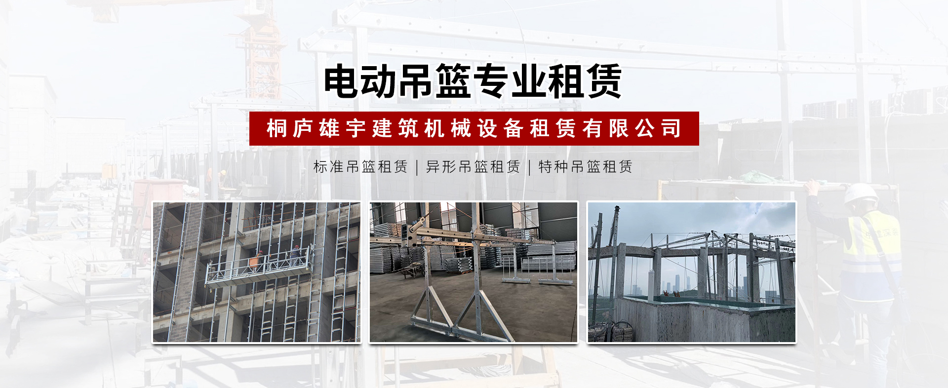 桐廬雄宇建筑機械設(shè)備租賃有限公司是一家專業(yè)從事吊籃租賃業(yè)務(wù)的公司,本公司擁有普通電動吊籃以及其他專用吊籃設(shè)備。公司自成立以來,承蒙業(yè)內(nèi)同仁已經(jīng)各界朋友的關(guān)愛與支持,始終秉承"以客戶為根本,以信譽求發(fā)展"的經(jīng)營理念,堅持"精心管理,優(yōu)質(zhì)服務(wù)"的服務(wù)宗旨,多年以來...